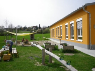 Beide Gruppenräume haben einen direkten Zugang zu jeweils einer eigenen Terrasse und zum gemeinsamen ca. 1700m² großen Spielplatz. Weiters ist der Zugang zum Spielplatz von einem der beiden Waschräume möglich, dieser dient auch als Schmutzschleuse.
